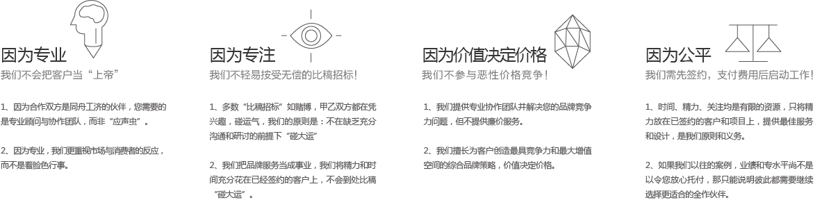 我們不用高價格嚇人,也不用假承諾唬人,如果真誠還讓你猶豫,你這是在慫恿我們吹牛。好的藝術(shù)作品可以有一千種解讀,而好的廣告設(shè)計是抽絲剝繭,將一千種可能的誤解消除。廣告是門以小見大的學(xué)問,創(chuàng)意是對現(xiàn)實的排列重組,我們不像高深的藝術(shù)品把人推到云霧里去,我們是把明明存在卻總被忽略的事實,變得顯而易見。